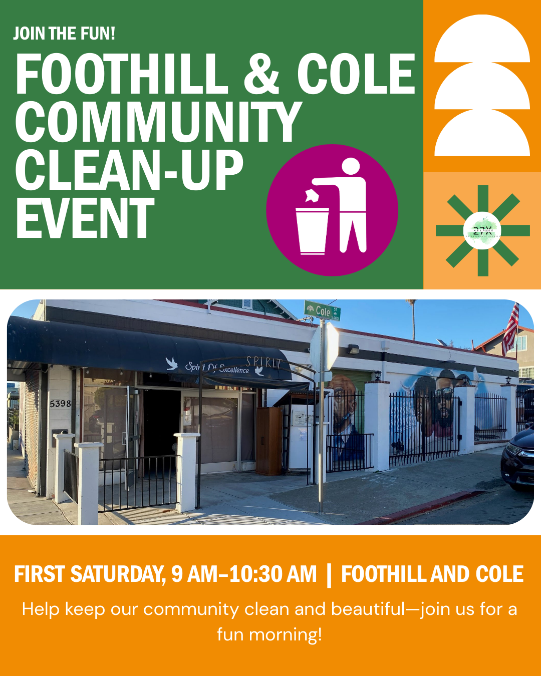 Foothill & Cole St Community Clean Up ๐ฎ Saturday, April 4, 2026 9:00โฏAM 10:30โฏAM Corner of Foothill Blvd & Cole St (map) Google Calendar ICS